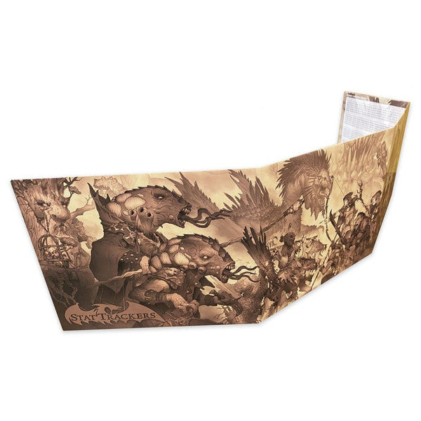 Original, brilliantly-illustrated, 4-panel DM screen. The artwork features Monsters and Heroes from our Friends & Foes Collection, pitted against each other in an epic battle scene! The DM side of the screen is dry- and wet- erase friendly and has a built in hit point tracker, as well as essential 5e rules reference. Made for DMs, by DMs. Original illustration by Mike Faille.