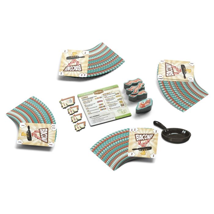 Bacon is a fixed-partnerships climbing game for 4 or 6 players that is all about going out early as a team. The only team that will score is the team that goes out first, but their score will depend on when the rest of the team goes out. If your team does NOT go out first, your job is simple: make the other team go out as late as possible.