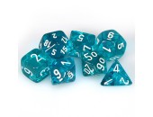 Teal translucent 7-set polyhedral dice set with white numbers.