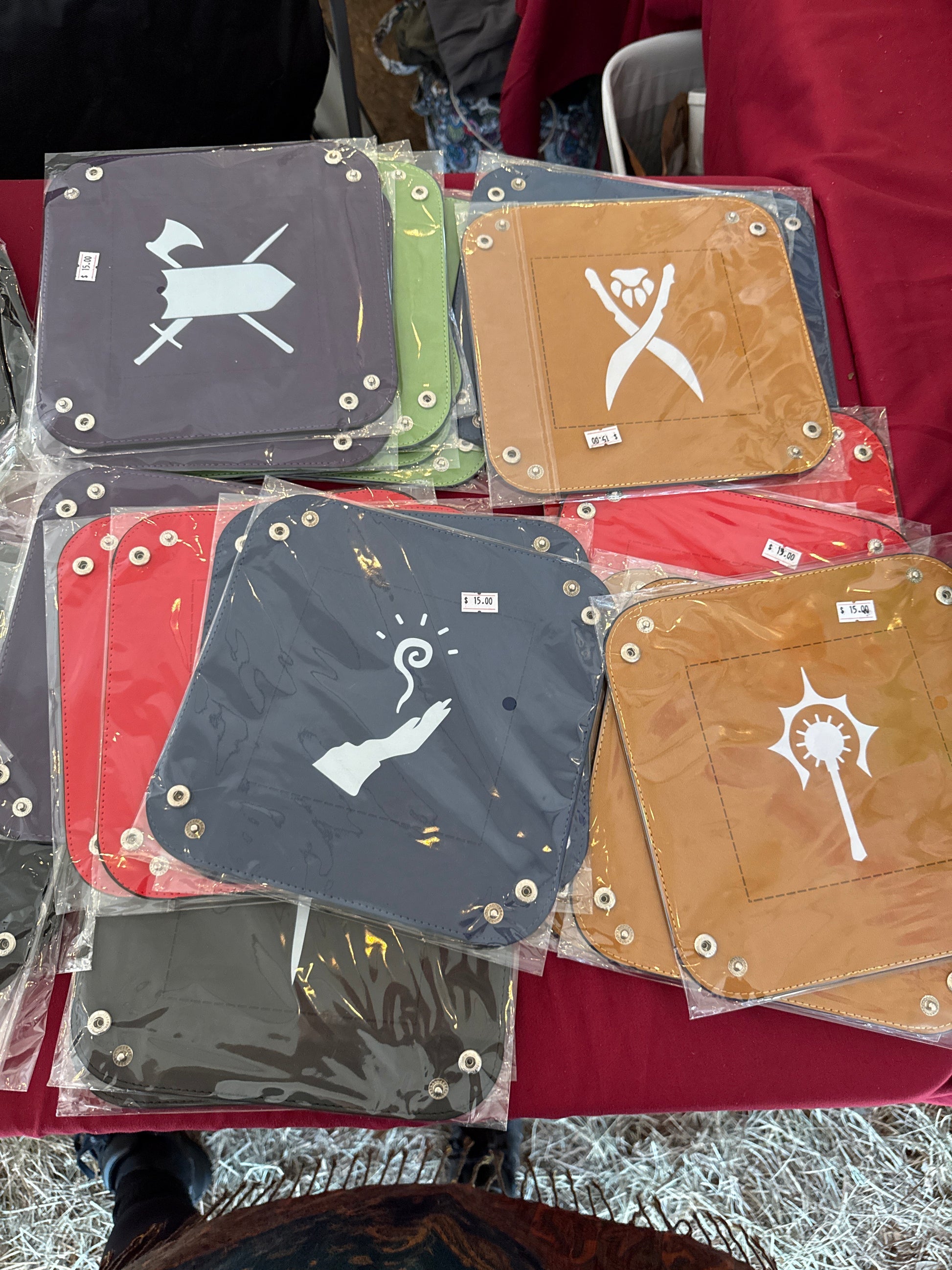 Class dice trays with leather backing and snap corners. Variety of colors available.