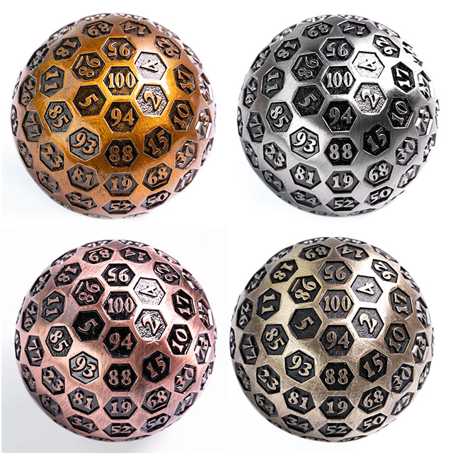 A single polyhedral dice - 100 sided, 45 mm diameter in silver.