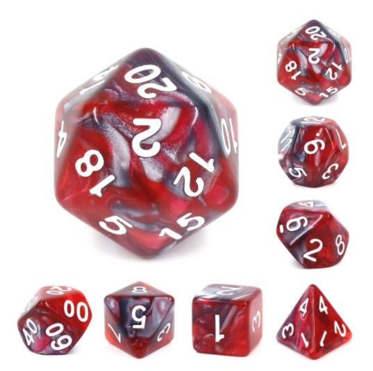 7 Set of Steel and Red Swirl Acrylic Dice with White Numbers.