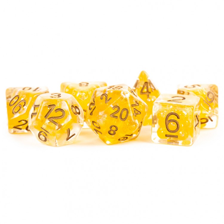 Beautiful pearls are carefully infused into a transparent resin in Metallic Dice Games’ pearl line.