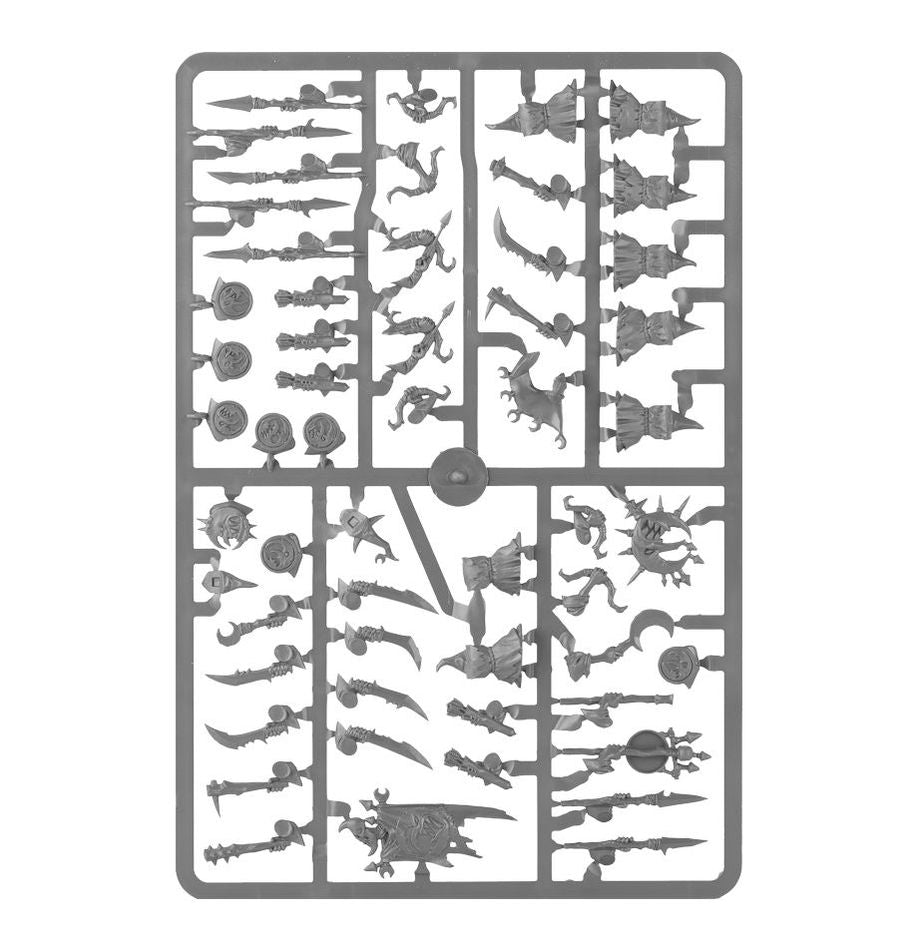 Moonclan Stabbas form ragged ranks that advance upon the foe with gongs clanging and banners waving. Eyes bulging with the madness of the Gloomspite, they pour over the enemy lines and stab wildly at everything in their path.