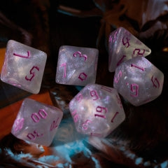 7 Set of white acrylic dice with pink numbers.